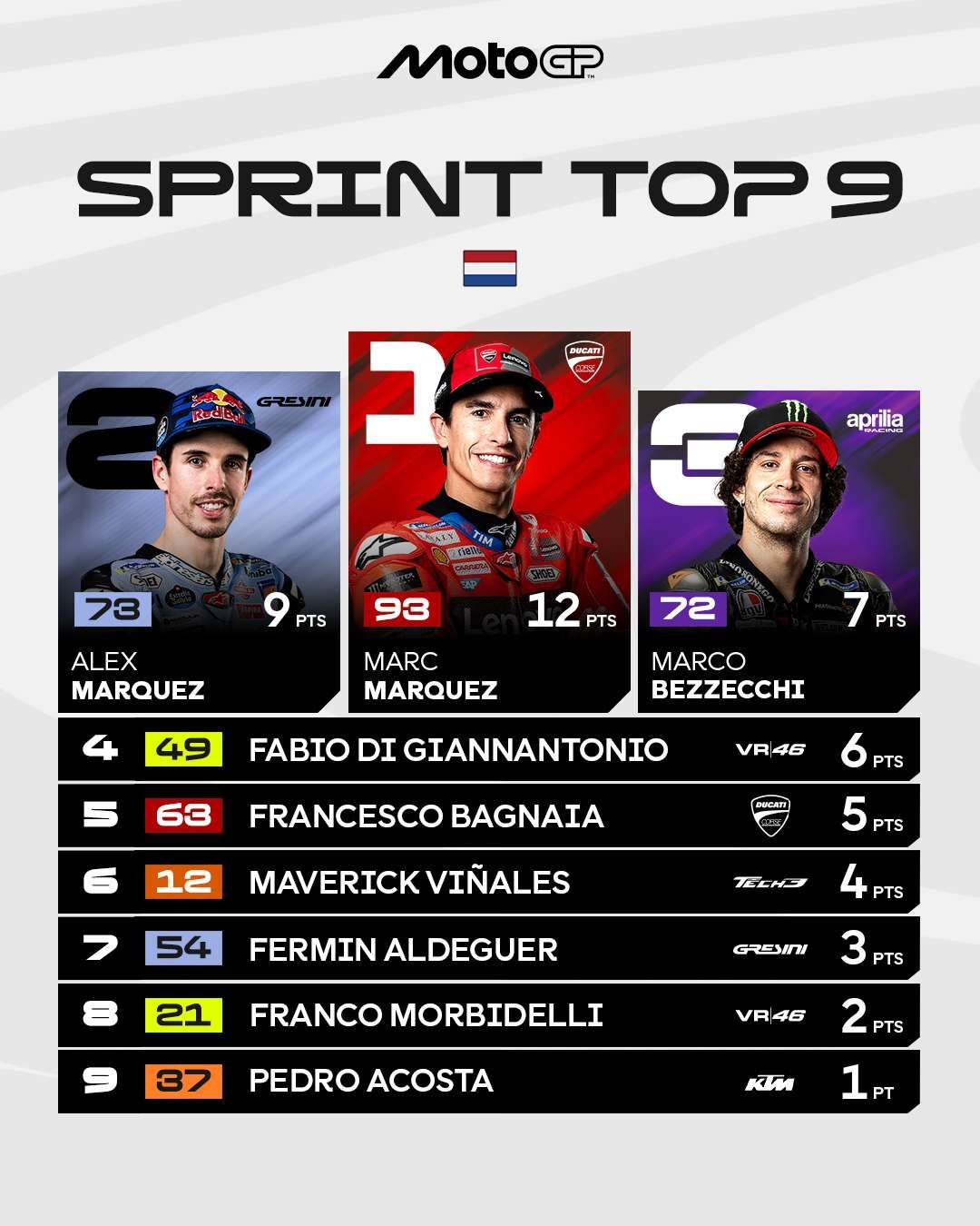 Berikut adalah hasil lima besar Sprint Race MotoGP Belanda 2025 :