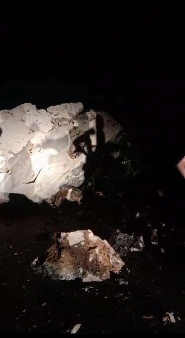 KBRN, Bone : Sebuah potongan batu kapur berukuran besar jatuh dan menutupi badam jalan poros Maros - Bone di daerah Kappang, Kabupaten Maros, Sulawesi Selatan, Minggu (23//7/23). Kejadian tersebut diperkirakan sekitar pukul 01.30 Wita dini hari.
