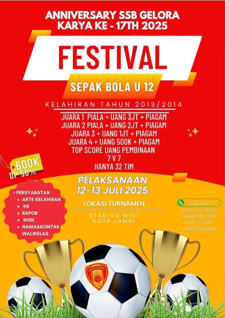 KBRN,Jambi: Dalam rangka anniversary ke 17 tahun, Sekolah Sepak Bola (SSB) Gelora Karya Jambi menggelar festival Sepak Bola usia 12. Kegiatan yang dijadwalkan berlangsung pada 12 s.d 13 Juli 2025, bertempat di Stadion Mini kota Jambi.