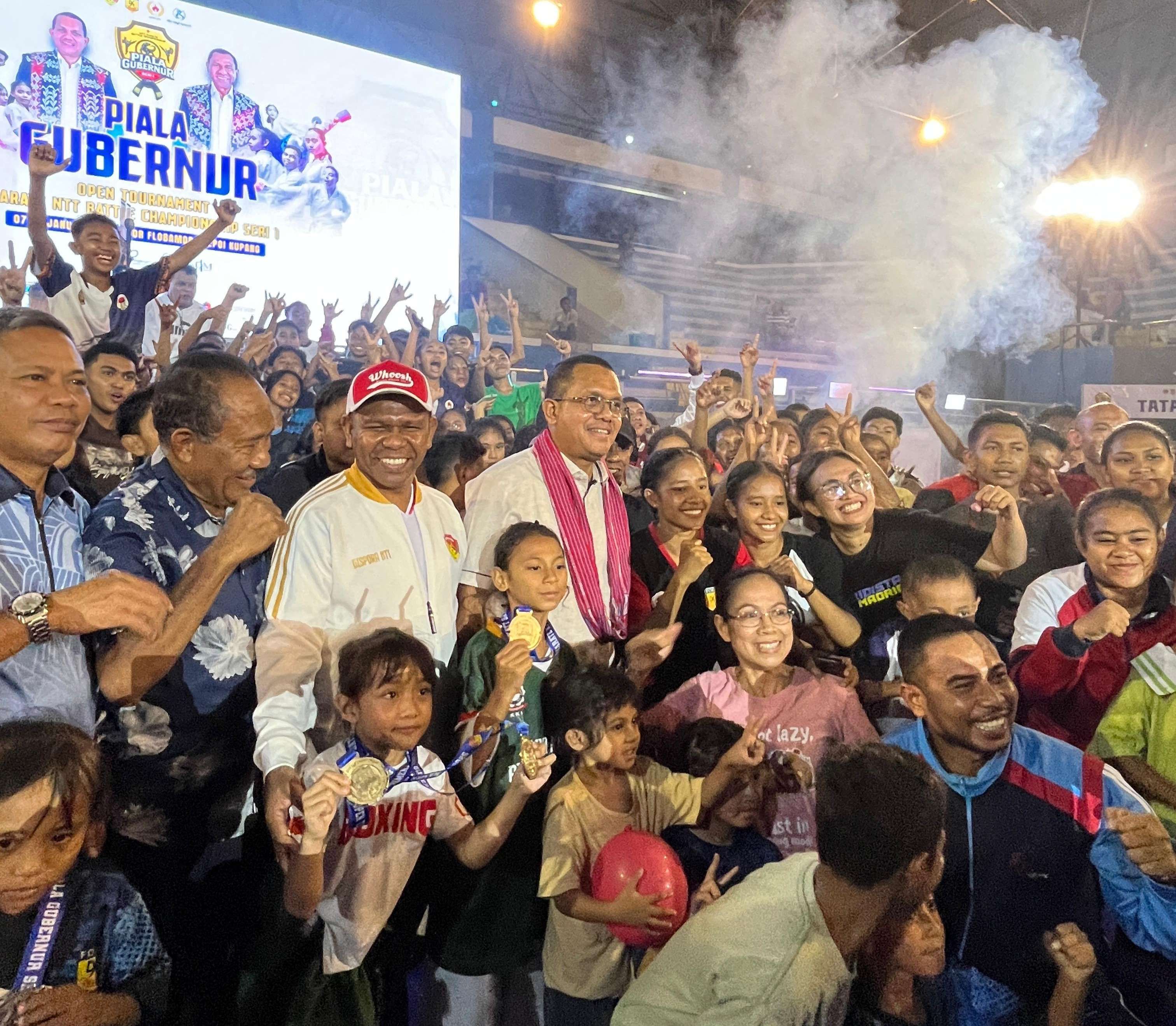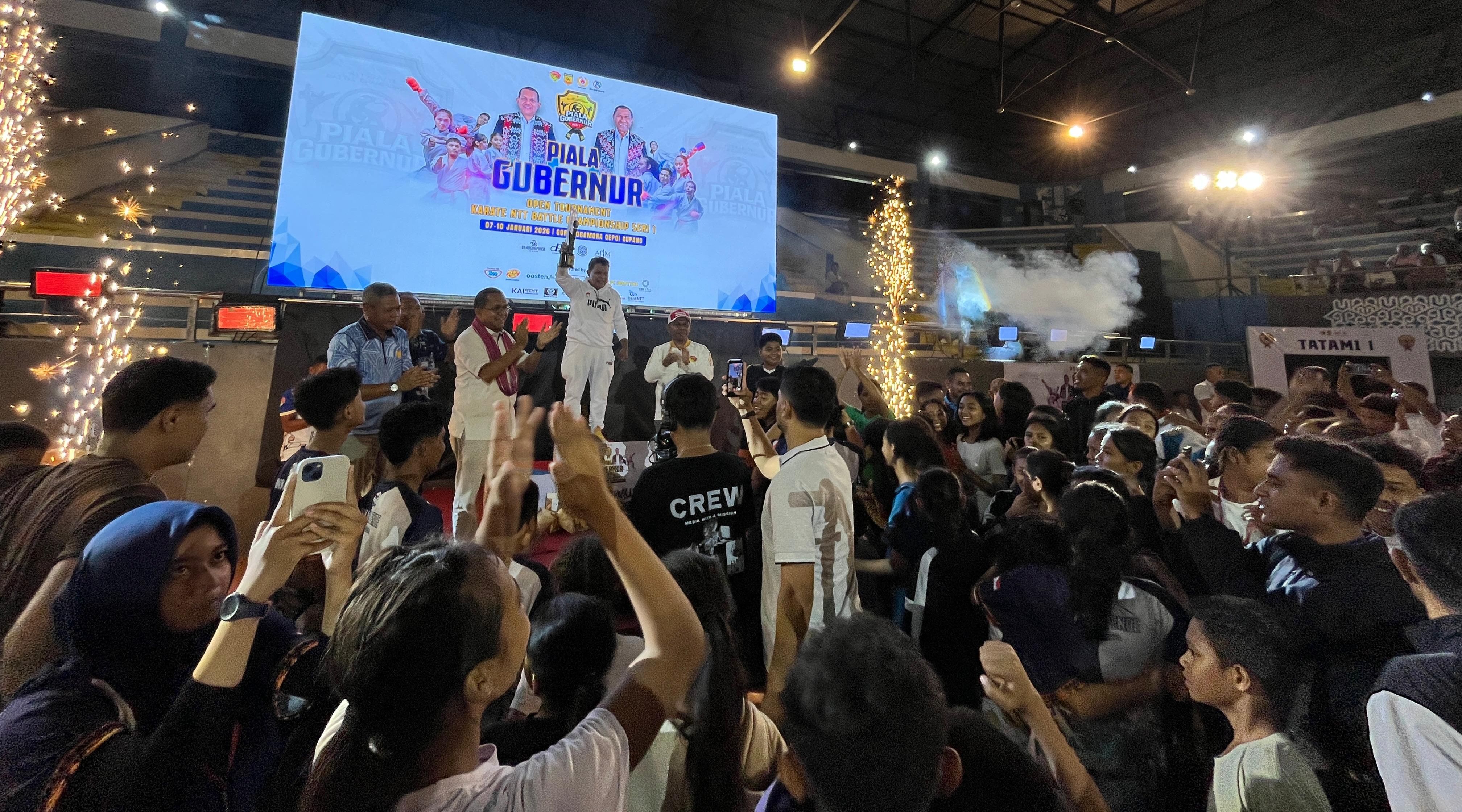 KBRN,Kupang: Gubernur NTT, Emanuel Melkiades Laka Lena mengapresiasi pelaksana even Open Tournament Karate Battle Championship Piala Gubernur Seri 1, bertempat di GOR Flobamora Oepoi Kupang. Ia mengapresiasi pelaksana single even ini saat memberi sambutan pada upacara penutupan yang berlangsung pada, Sabtu (10/1/2026) malam di GOR Flobamora Oepoi Kupang.