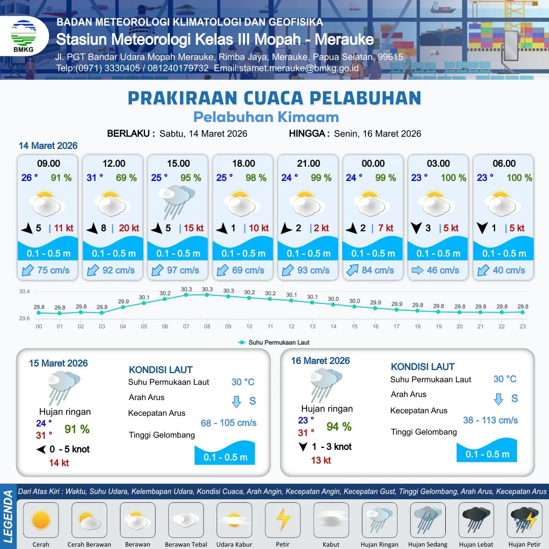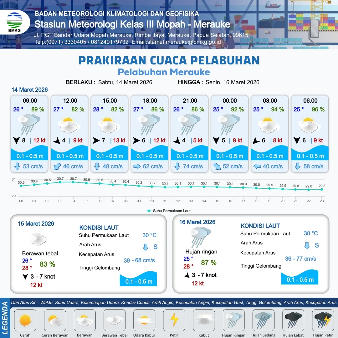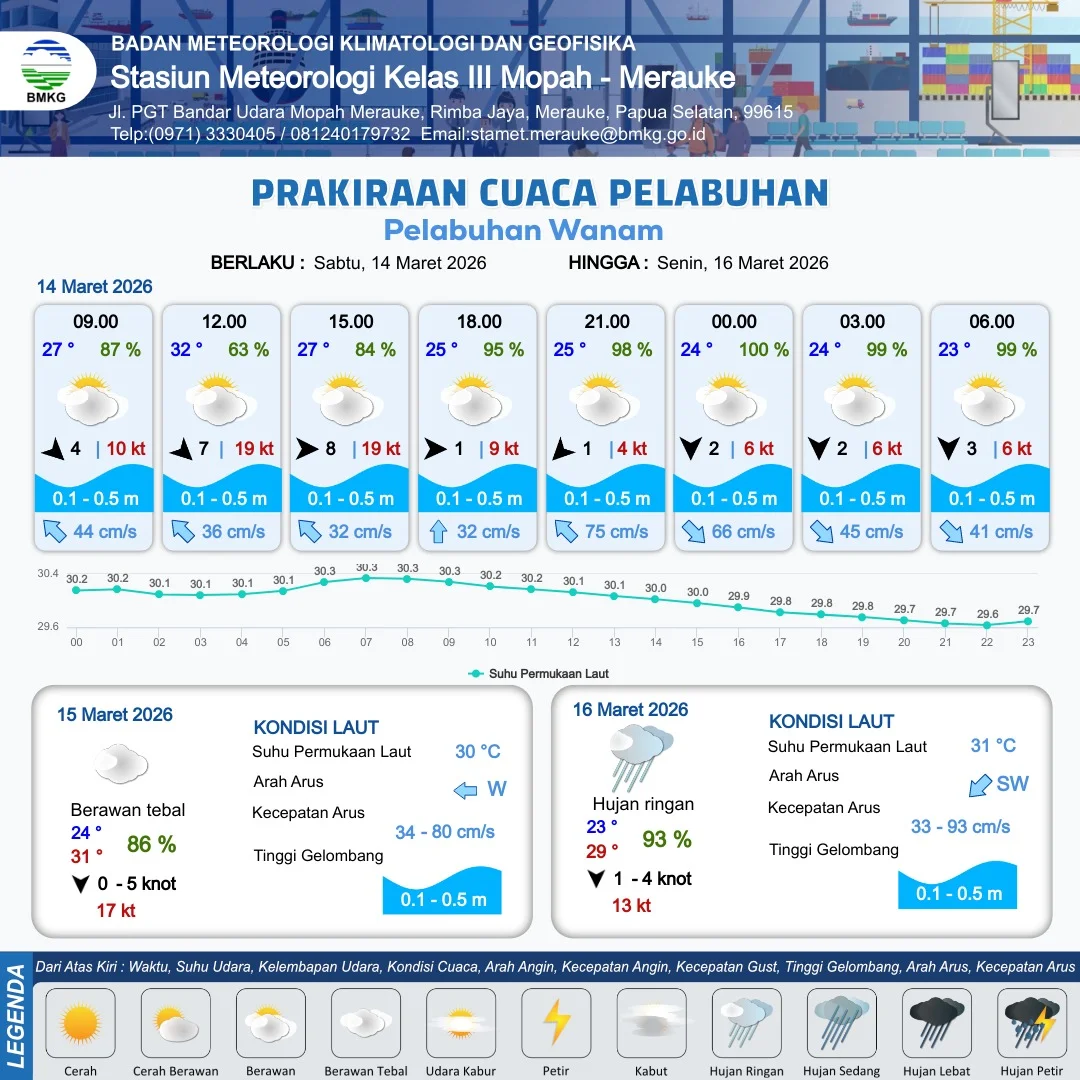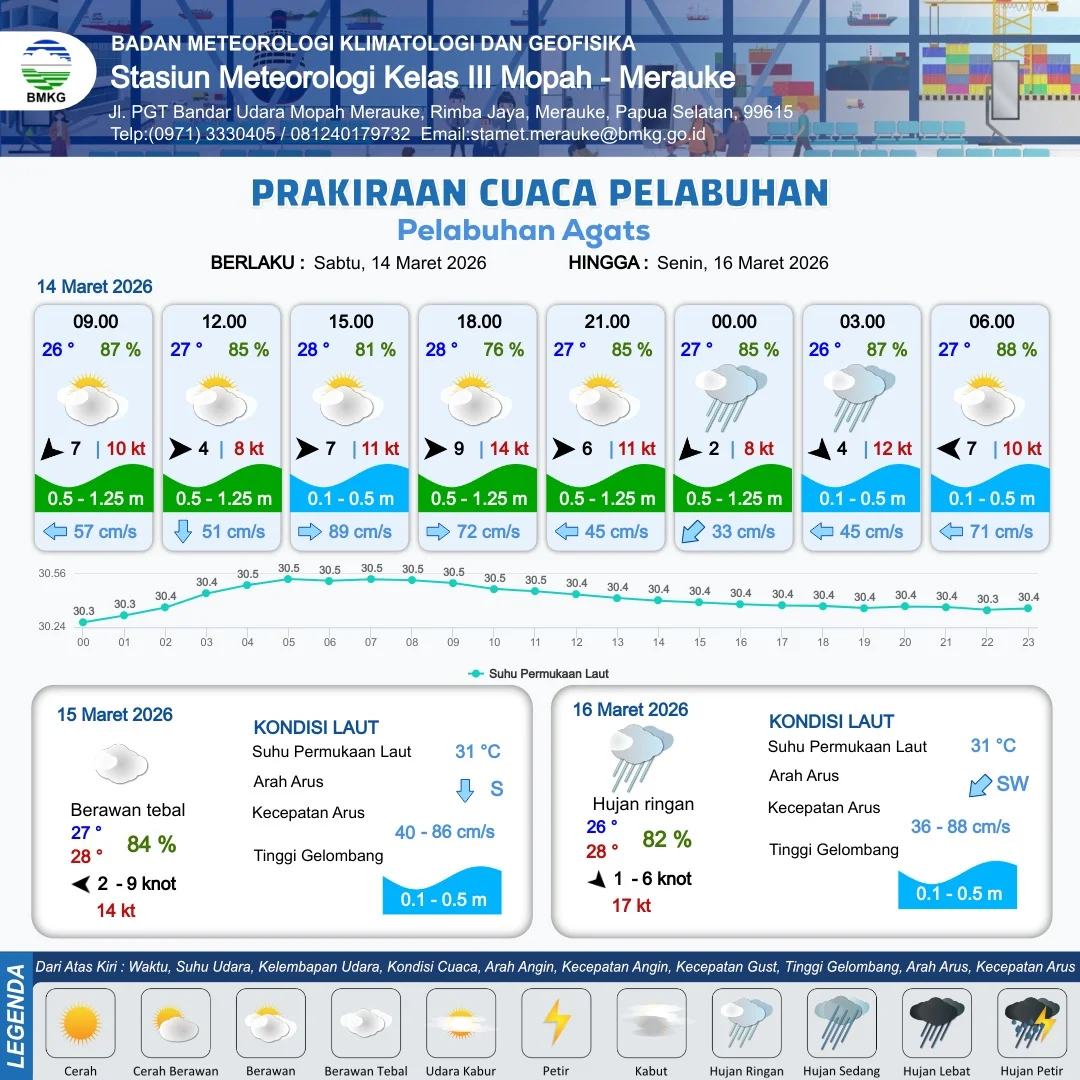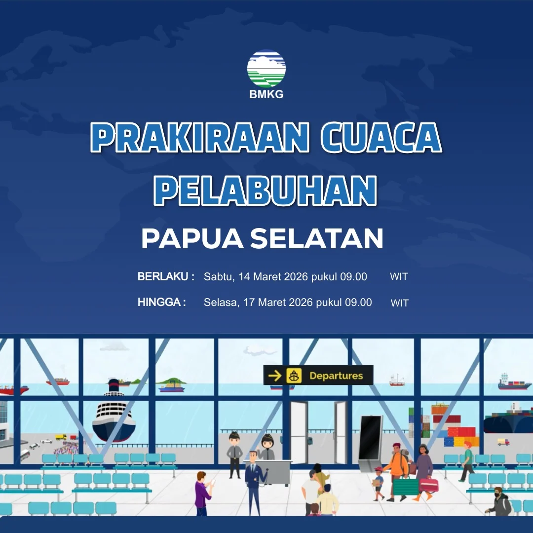 RRI.CO.ID, Merauke : Badan Meteorologi, Klimatologi dan Geofisika Stasiun Meteorologi Kelas III Mopah Merauke merilis informasi prakiraan cuaca wilayah pelabuhan Papua Selatan meliputi : Pelabuhan Merauke, Pelabuhan Wanam, Pelabuhan Kimam dan Pelabuhan Agats. Berlaku dari hari Sabtu tanggal 14 Maret 2026 pukul 09.00 WIT hingga hari Selasa tanggal 17 Maret 2026 pukul 09.00 WIT.
