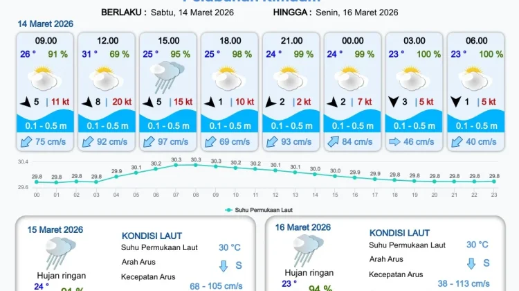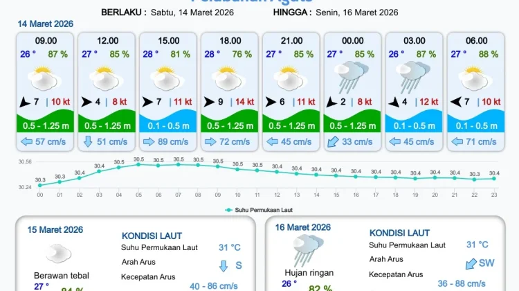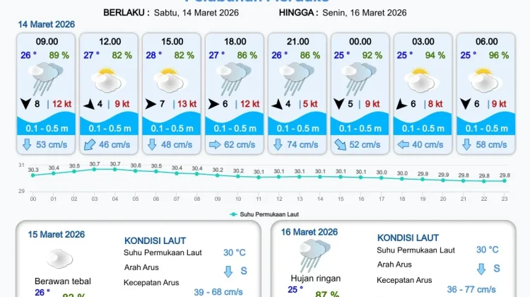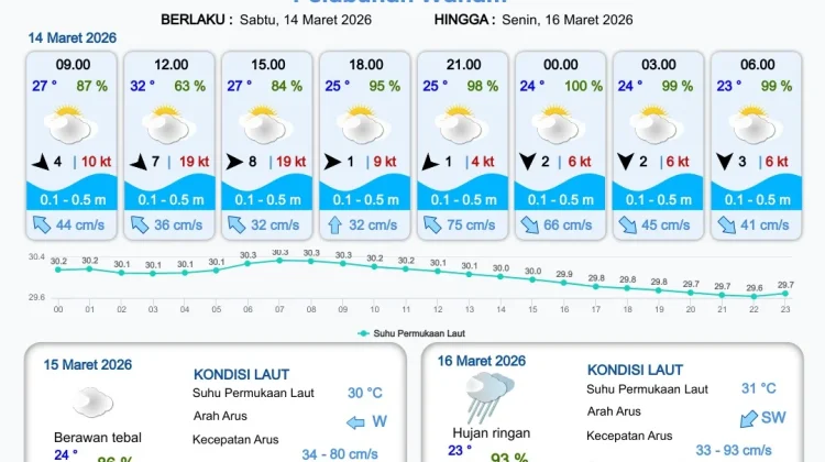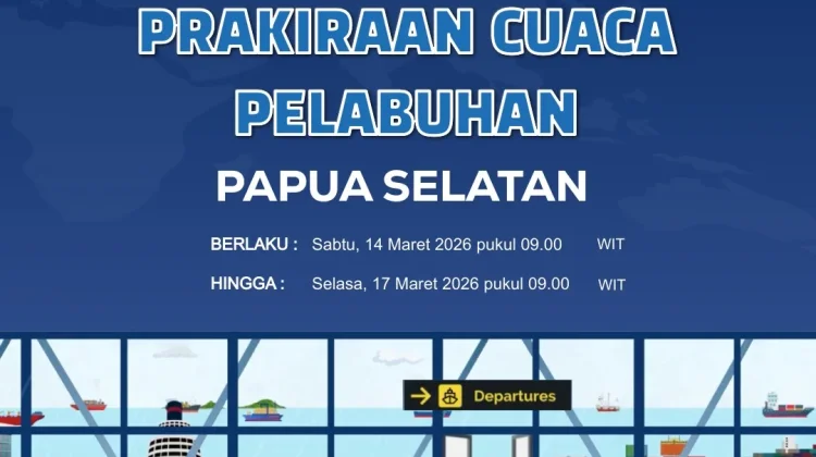 RRI.CO.ID, Merauke : Badan Meteorologi, Klimatologi dan Geofisika Stasiun Meteorologi Kelas III Mopah Merauke merilis informasi prakiraan cuaca wilayah pelabuhan Papua Selatan meliputi : Pelabuhan Merauke, Pelabuhan Wanam, Pelabuhan Kimam dan Pelabuhan Agats. Berlaku dari hari Sabtu tanggal 14 Maret 2026 pukul 09.00 WIT hingga hari Selasa tanggal 17 Maret 2026 pukul 09.00 WIT.