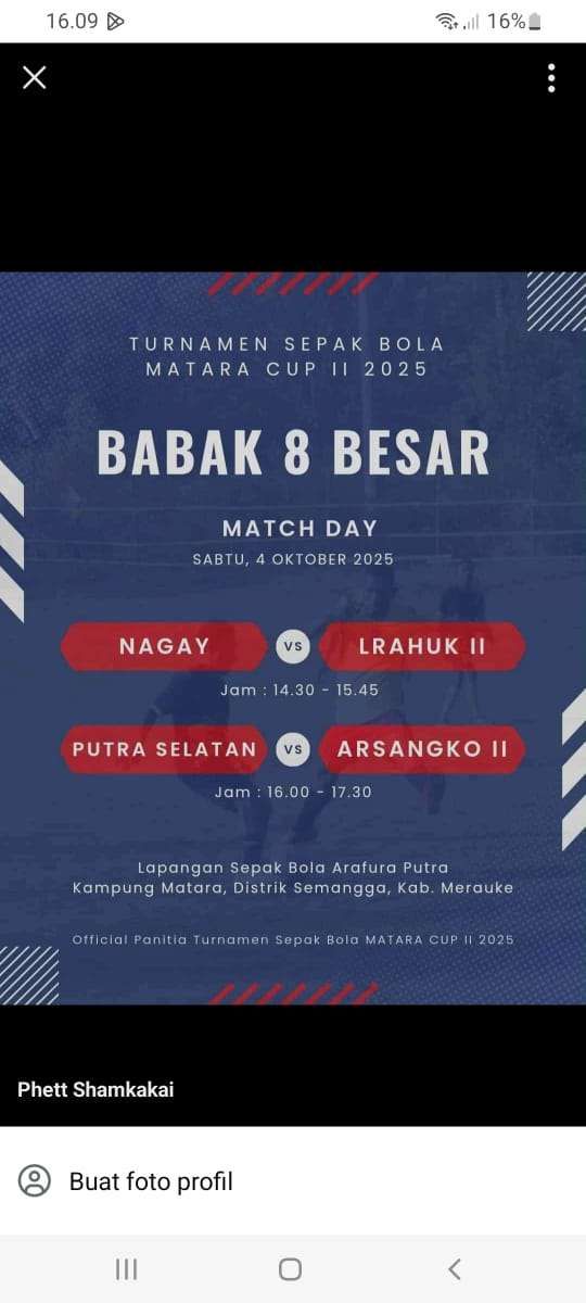 KBRN,Merauke : Memasuki babak delapan besar turnament sepak bola Matara cup II tahun 2025 diawali tim Nagay akan melawan Tim Lahuk dua di lapangan matara distrik Semangga Merauke.