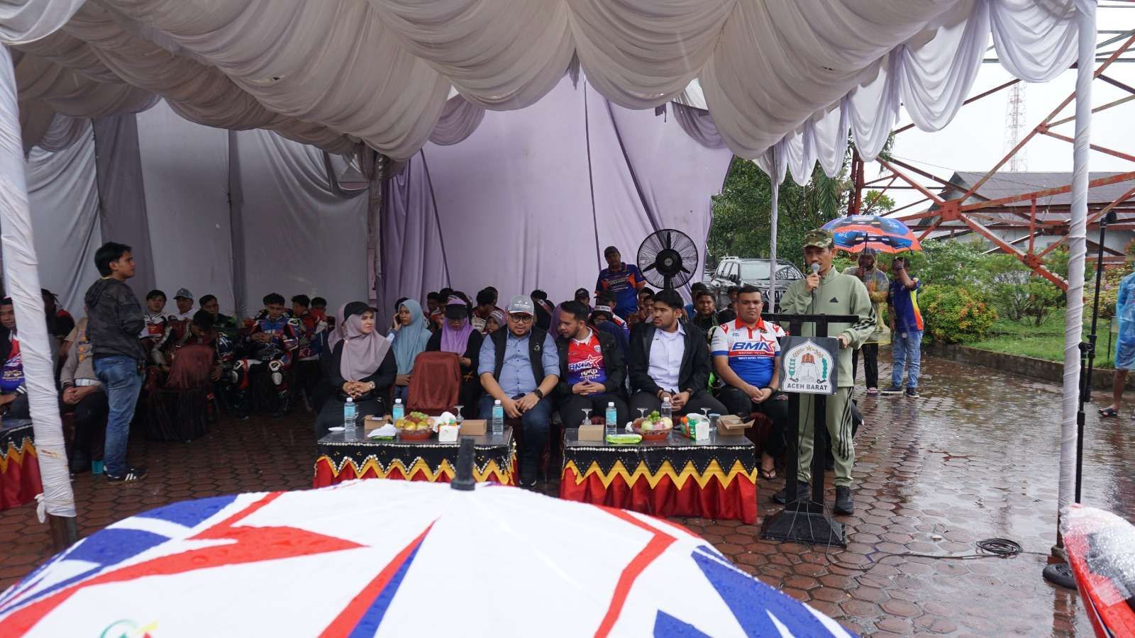 KBRN, Meulaboh : Bupati Aceh Barat, Tarmizi, SP, MM, secara resmi membuka ajang Kejurprof Balap Motor Honda Cup Race IMI Aceh Series Putaran 1 Trophy Bupati dan Wakil Bupati Aceh Barat, Minggu (20/7/2025). Pembukaan berlangsung di Sirkuit Non Permanen (NP) Jalan Merdeka, Meulaboh, dalam suasana hujan yang mengguyur wilayah Aceh Barat.