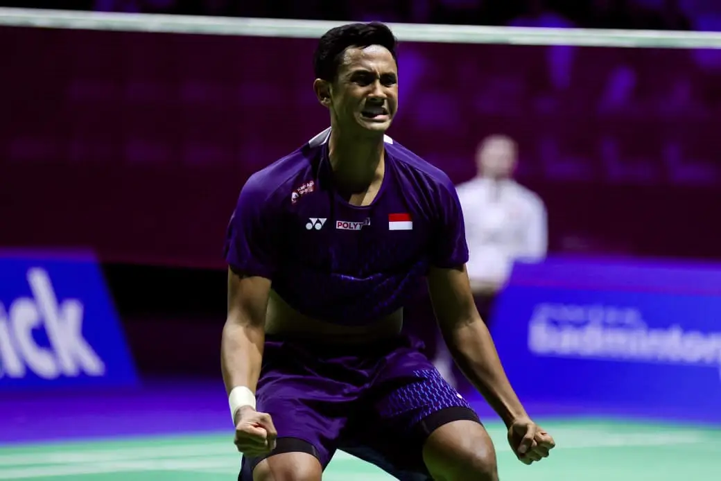 Alwi Farhan berselebrasi usai mengalahkan Li Shi Feng di babak semifinal Swiss Open 2026, Sabtu, 14 Maret 2026 (Foto: Humas PBSI)