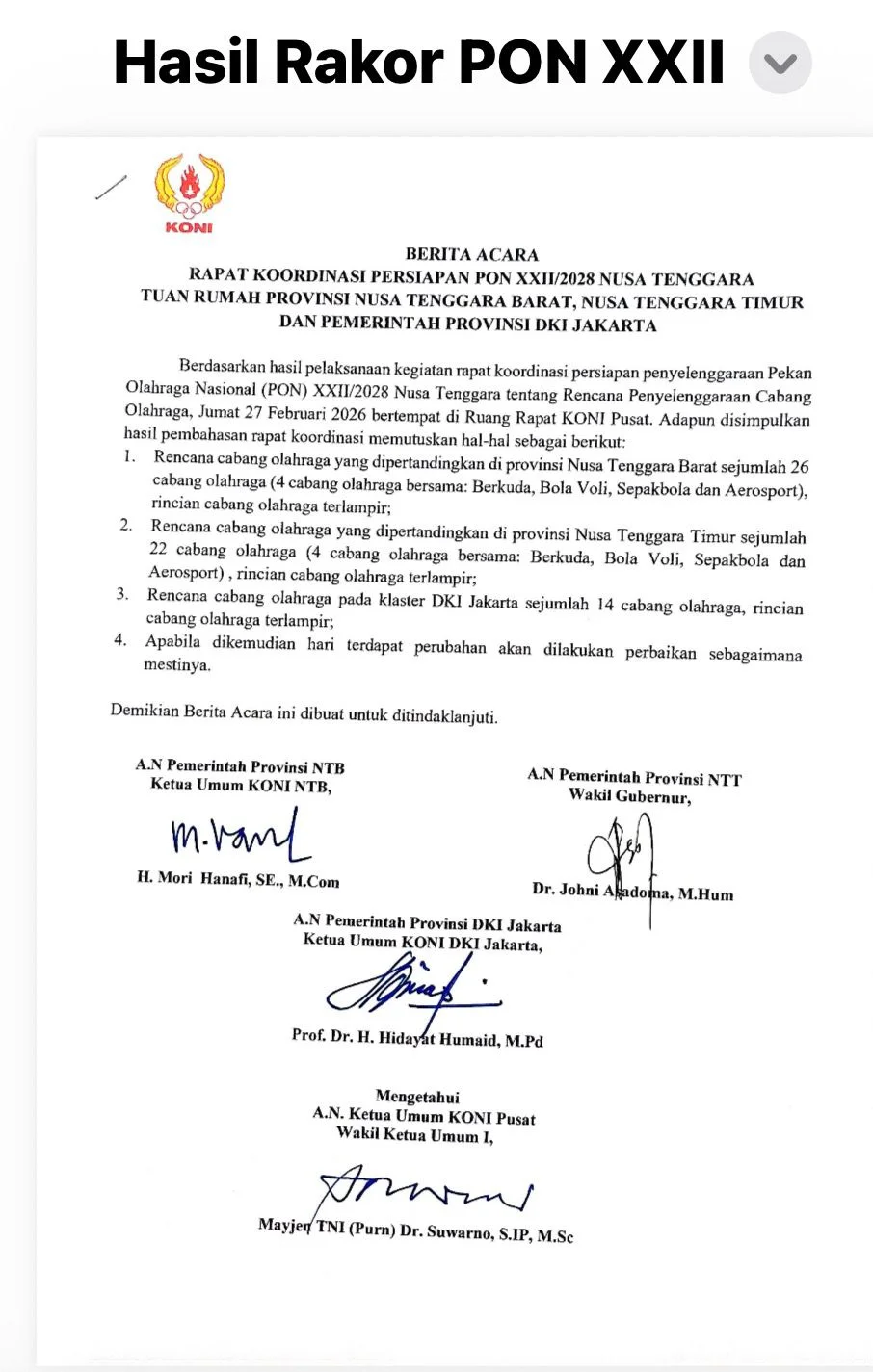 RRI.CO.ID - SORONG – Pelaksanaan Pekan Olahraga Nasional (PON) XXII tahun 2028 dipastikan akan tampil beda. Jika sebelumnya hanya melibatkan satu atau dua provinsi, pesta olahraga terbesar di Indonesia edisi ke-22 tersebut rencananya akan dilangsungkan di tiga wilayah sekaligus: Nusa Tenggara Timur (NTT), Nusa Tenggara Barat (NTB), dan DKI Jakarta.